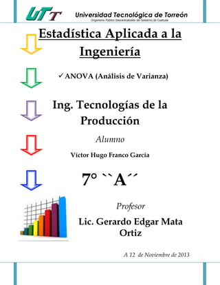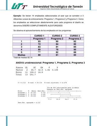 Este documento presenta un ejemplo de un análisis de varianza (ANOVA) utilizando datos de 14 empleados que se sometieron a 3 programas de entrenamiento de manera aleatoria. Muestra las calificaciones promedio de los empleados en cada programa, con un promedio total de 82.14. El estudiante que realizó este análisis de varianza fue Víctor Hugo Franco García de la Universidad Tecnológica de Torreón.