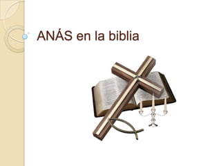 El documento describe a Anás, un sumo sacerdote judío influyente en el siglo I d.C. Aunque fue destituido como sumo sacerdote en el 15 d.C., aún mantenía poder e influencia sobre sus sucesores. Interrogó preliminarmente a Jesús antes de entregarlo a Caifás, el sumo sacerdote designado, quien luego lo llevó ante Poncio Pilatos para ser crucificado.