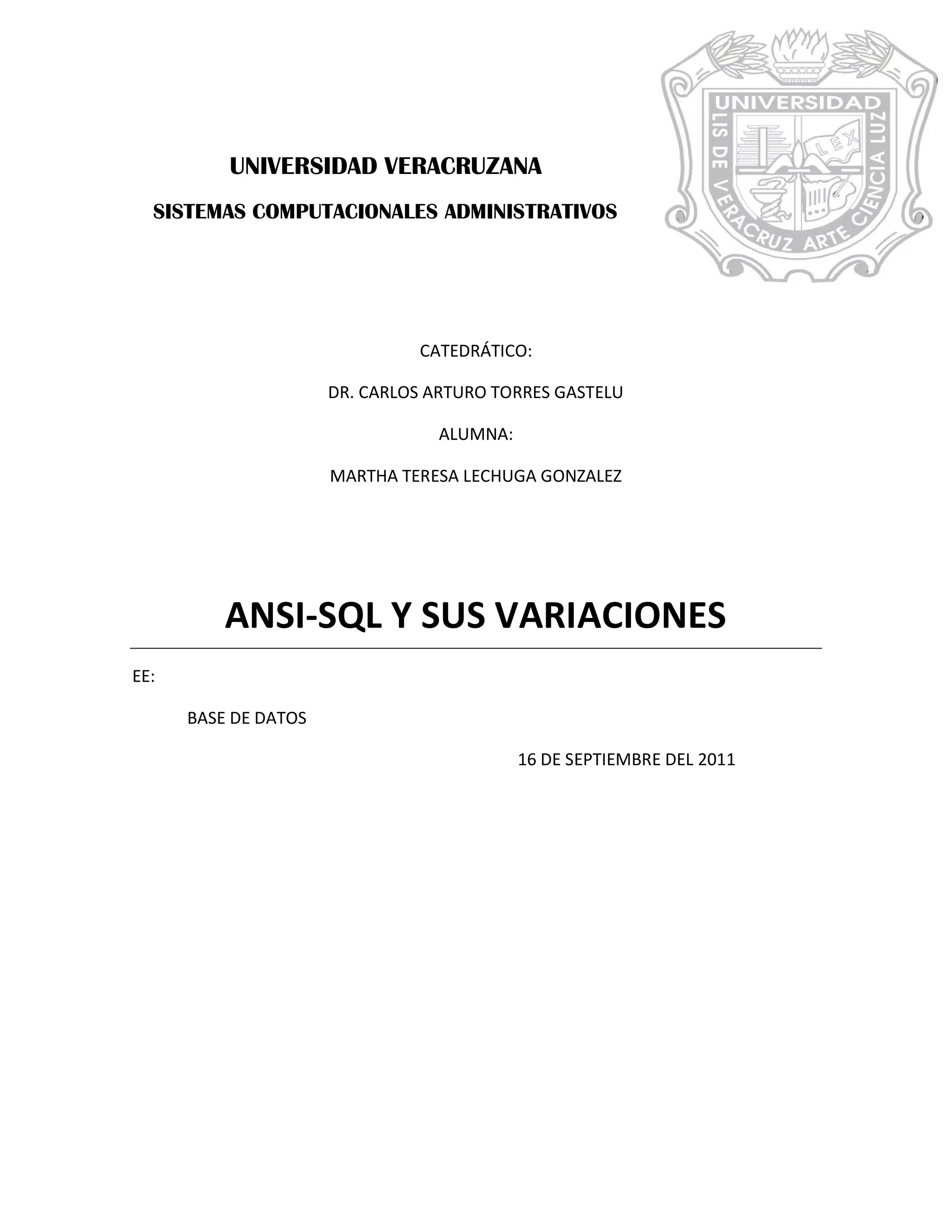 El documento describe la evolución de ANSI SQL a lo largo del tiempo. Comenzó como SEQUEL en 1970 y fue estandarizado por ANSI en 1986 como SQL-86. Versiones posteriores incluyen SQL-89, SQL-92, SQL:1999 y SQL:2003, cada una con mejoras y nuevas características. ANSI SQL es un lenguaje declarativo que permite la definición, manipulación y control de datos en bases de datos relacionales. Incluye sublenguajes para definición, manipulación, control y consulta de datos.