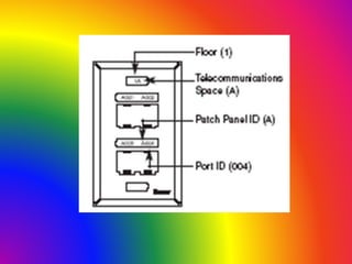 Este documento resume las principales secciones de la norma TIA/EIA 606A, la cual estandariza las prácticas de administración y etiquetado para sistemas de cableado estructurado. La norma especifica cuatro clases de sistemas que van desde edificios sencillos hasta ambientes multicampus, e indica los requisitos de identificación y documentación para cada componente y conexión del cableado según la clase del sistema.