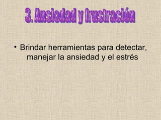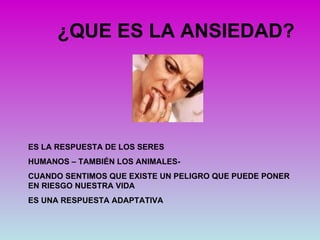 Este documento habla sobre la ansiedad, definida como la respuesta de los seres humanos ante la percepción de peligro. Explica que la ansiedad puede ser positiva cuando hay un peligro real o negativa cuando los miedos son imaginarios. También describe algunos síntomas de ansiedad y mecanismos psicológicos como la represión y la racionalización que las personas usan para evitar la ansiedad.