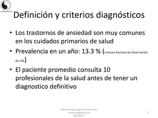 Los trastornos de ansiedad son comunes y afectan a uno de cada 8 personas. El documento describe los criterios diagnósticos de varios tipos de trastornos de ansiedad, incluido el trastorno de ansiedad generalizada, y discute factores como la genética y el estrés que contribuyen a la patofisiología. Propone un enfoque integrativo para el tratamiento que incluye ejercicio, nutrición, acupuntura, suplementos, terapias conductuales y cognitivas, y en algunos casos medicamentos.