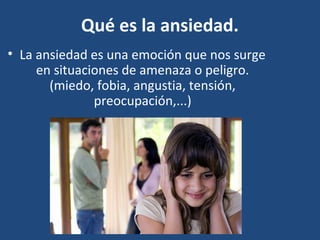 Este documento describe diferentes tipos de ansiedad severa como el trastorno de pánico, la ansiedad generalizada y sus síntomas. Explica que la ansiedad es una emoción que surge ante situaciones de amenaza y que los trastornos de ansiedad se caracterizan por sentimientos excesivos de preocupación. Describe los tratamientos conductuales y farmacológicos para la ansiedad severa, incluyendo terapia cognitivo-conductual e inhibidores selectivos de serotonina.