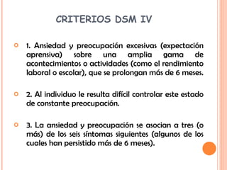 El documento describe los criterios del trastorno de ansiedad generalizada según el DSM-IV y los síntomas asociados a este trastorno. También explica brevemente la terapia de exposición y prevención de respuesta conocida como entrenamiento en el manejo de la ansiedad, la cual se ha utilizado con éxito para tratar este trastorno y otros problemas de ansiedad.