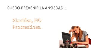 La ansiedad es una respuesta del organismo a situaciones amenazantes, que puede ser transitoria o convertirse en un trastorno persistente. Existen tratamientos psicológicos, como técnicas cognitivo-conductuales, y farmacológicos, que requieren la prescripción de un psiquiatra. Se destaca la importancia de la prevención y la no automedicación ante los síntomas de ansiedad.