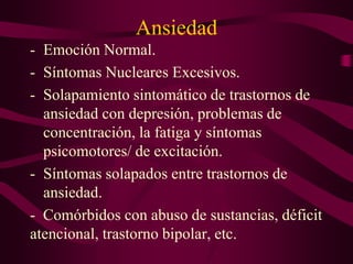 Este documento resume información sobre los ansiolíticos, incluyendo sus síntomas, neurotransmisores involucrados como el GABA, el papel de la amígdala, y diferentes clases de fármacos ansiolíticos como las benzodiacepinas, ciclopirrolonas e imidazopiridinas. Describe sus indicaciones, contraindicaciones, efectos adversos, interacciones y sobredosis.