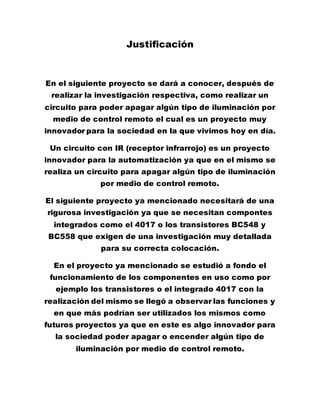 Este documento describe un proyecto para crear un circuito que permita apagar iluminación de manera remota usando un receptor infrarrojo. Explica que se necesitará investigar componentes como el integrado 4017 y los transistores BC548 y BC558. También incluye información técnica sobre estos componentes y sus aplicaciones. Finalmente, presenta un presupuesto para los materiales necesarios para el proyecto.