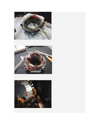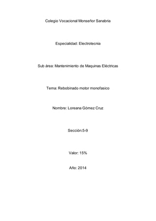 Este documento describe el proceso de rebobinado de un motor monofásico realizado por una estudiante. Explica las partes principales de un motor de fase partida, como el rotor, el estátor y los escudos. También lista los materiales necesarios y los datos que deben tomarse antes de comenzar el rebobinado, como el número de polos, el paso de la bobina y el número de espiras. Al final, la estudiante concluye que el proceso le permitió poner en práctica los conocimientos adquiridos sobre el funcionamiento de los mot