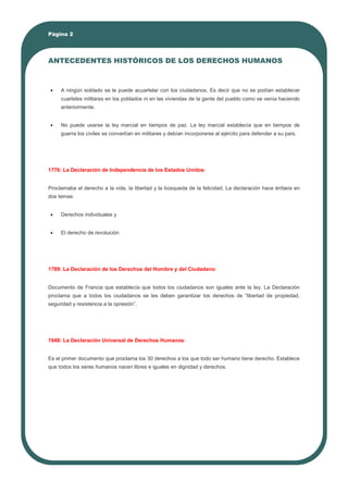 El documento resume los antecedentes históricos clave de los derechos humanos, incluyendo la Carta Magna de 1215 que estableció límites al poder del rey y protegió ciertos derechos de los ciudadanos en Inglaterra, la Petición de Derechos de 1628 que estableció más libertades civiles, la Declaración de Independencia de 1776 que proclamó el derecho a la vida, la libertad y la búsqueda de la felicidad, la Declaración de los Derechos del Hombre y del Ciudad
