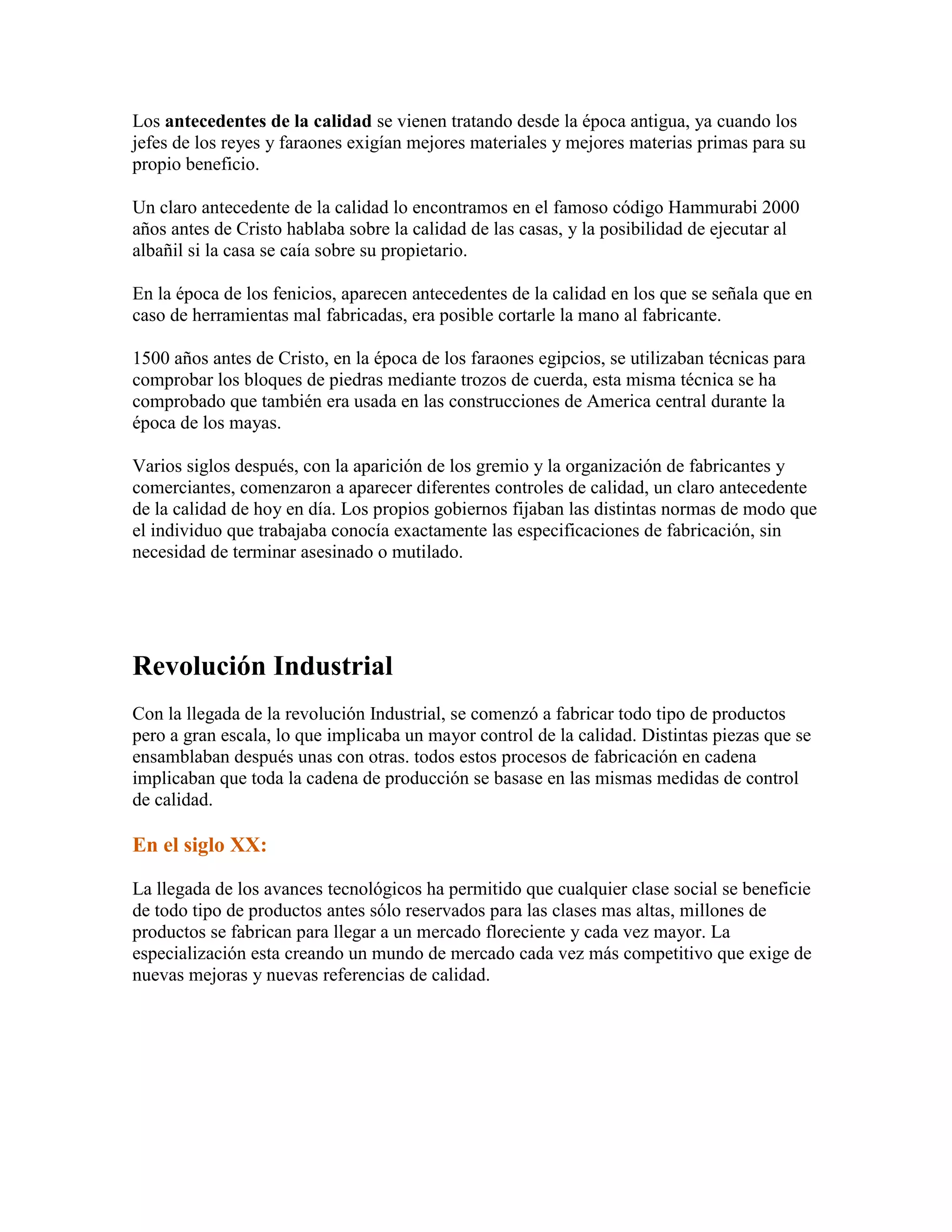 Los antecedentes de la calidad se remontan a la antigüedad, cuando los gobernantes exigían altos estándares de calidad en materiales. En el Código de Hammurabi se establecían sanciones por casas de baja calidad, y los fenicios podían mutilar a artesanos por herramientas defectuosas. Durante la Revolución Industrial, la producción masiva requirió mayores controles de calidad, y en el siglo XX la tecnología permitió la fabricación masiva de productos para un mercado cada vez más competit