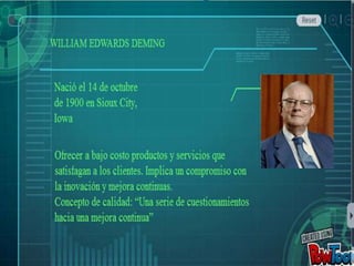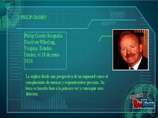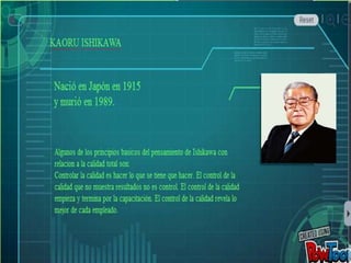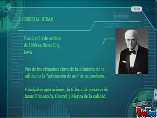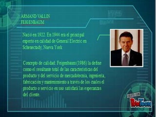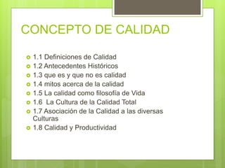 Este documento describe la evolución histórica del concepto de calidad a través de diferentes épocas, desde la antigüedad hasta la actualidad. Comienza con definiciones de calidad y antecedentes históricos desde la prehistoria, pasando por la edad antigua, la edad media y la edad moderna. Luego describe el desarrollo del concepto de calidad durante la Segunda Guerra Mundial y la influencia de Deming, Juran y Feigenbaum. Finalmente, resume las cuatro etapas del desarrollo conceptual de la calidad: control