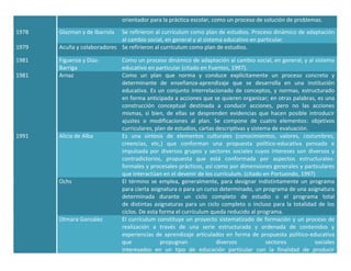 El documento presenta definiciones de currículum de varios autores a través de los años. Franklin Bobbit definió el currículum en 1918 como el rango total de experiencias dirigidas a desarrollar habilidades individuales. Ralph Tyler en 1949 dijo que el currículum son todas las experiencias de aprendizaje planeadas por la escuela para alcanzar sus metas educativas. Otmara González en 1994 describió el currículum como un proyecto sistematizado de formación y un proceso de realización a través de contenidos y experiencias de aprendizaje