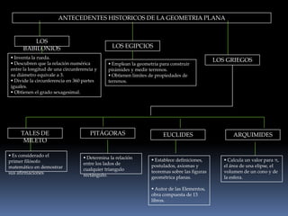 Los babilonios inventaron la rueda y los egipcios descubrieron la relación entre la longitud de una circunferencia y su diámetro. Los griegos desarrollaron la geometría para medir terrenos y establecieron definiciones, postulados y teoremas sobre figuras geométricas planas. Euclides es conocido por su obra Los Elementos compuesta de 13 libros sobre geometría plana.