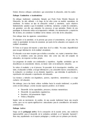 Este documento presenta una introducción a los diferentes enfoques curriculares, incluyendo el enfoque conductista, activo, constructivista, epistemológico e integral. Explica las características y limitaciones de cada enfoque, y cómo cada uno ha influido en el desarrollo de los enfoques posteriores. El documento también analiza las relaciones entre las filosofías educativas y las teorías de la educación.
