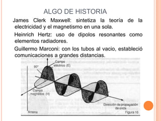 El documento resume la historia de las antenas desde Maxwell y su teoría electromagnética hasta Marconi y sus comunicaciones inalámbricas a larga distancia. Explica que una antena es un conductor que emite o recibe ondas electromagnéticas y que existen antenas emisoras y receptoras. Finalmente, clasifica los tipos de antenas y explica conceptos como su funcionamiento, directividad y diagramas de radiación.