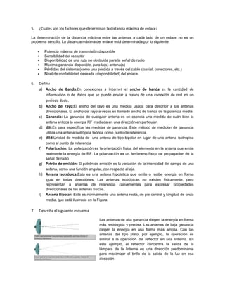 1. Las antenas son dispositivos que emiten o reciben ondas electromagnéticas. 2. Existen antenas direccionales que concentran la energía en una dirección y antenas omnidireccionales que emiten energía en todas direcciones. 3. Las características de las antenas incluyen su ganancia, ángulo de radiación, alcance y longitud de cable.