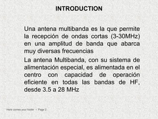 La antena multibanda permite la recepción de ondas cortas entre 3-30 MHz. Es alimentada en el centro para operar eficientemente entre 3.5-28 MHz. La antena G5RV, una antena multibanda, tiene 102 pies de largo y está diseñada para instalarse en áreas con espacio limitado. Calcula la longitud de onda para la banda de 20 metros y determina que la antena debe medir 31.36 metros de largo con una línea de bajada de 10.3 metros.