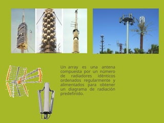 El documento detalla conceptos y aplicaciones de las antenas de array, compuestas por múltiples radiadores que optimizan el diagrama de radiación para diversas necesidades. Destaca el uso de antenas inteligentes que mejoran la cobertura, reducen interferencias y ofrecen servicios como radiolocalización. Se describen diferentes tipos de arrays según su geometría, elemento radiante y red, junto con ejemplos de aplicaciones en comunicaciones y tecnología.