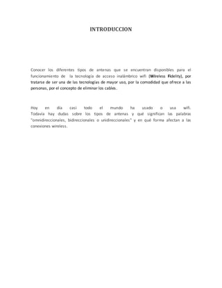 Este documento describe los diferentes tipos de antenas wifi, incluyendo antenas omnidireccionales, bidireccionales y unidireccionales. Explica que las antenas omnidireccionales son buenas para cubrir grandes áreas, las bidireccionales son útiles en pasillos, y las unidireccionales son mejores para enlaces punto a punto entre edificios. También describe antenas verticales, Yagi y parabólicas, y cómo sus patrones de radiación y ganancia las hacen más adecuadas para diferentes usos.