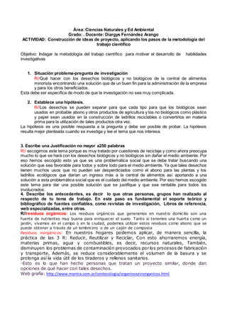 Este documento presenta los pasos de un proyecto de investigación sobre la gestión de desechos biológicos y no biológicos de una central de alimentos. Se plantea como situación problema la necesidad de encontrar una solución para estos desechos. La hipótesis sugiere que los desechos pueden separarse y reutilizarse, con los biológicos como abono y los no biológicos en construcción. El objetivo es examinar el problema y proponer una solución de reutilización. Se describen los materiales, procedimientos