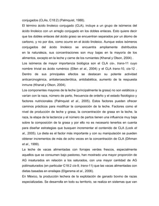 Este documento describe la composición de la grasa de la leche en vacas y cabras de diferentes razas bajo sistemas de alimentación variados. La grasa láctea contiene ácidos grasos que afectan la salud humana. La dieta animal es el factor más importante que determina la composición de grasa láctea, y pastoreo puede aumentar ácidos grasos beneficiosos como los conjugados del ácido linoleico. El objetivo es determinar los efectos de la raza y alimentación en la composición de grasa láctea.