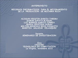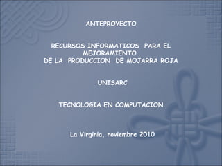 Este documento presenta un anteproyecto para implementar recursos informáticos que mejoren la producción de mojarra roja en Risaralda. Actualmente, los piscicultores de la región usan métodos artesanales y sus estanques son pequeños. El proyecto busca automatizar el monitoreo de parámetros como oxígeno, pH y temperatura para controlarlos y así aumentar la producción de una manera más eficiente. También incluirá un sistema de seguridad para detectar posibles robos cuando no haya personal presente.