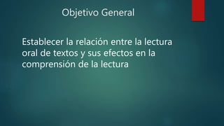 Este documento presenta un anteproyecto de investigación sobre las fallas en la lectura oral y su influencia en la comprensión de la lectura. El objetivo general es establecer la relación entre la lectura oral de textos y sus efectos en la comprensión. Se identificaron problemas con la lectura oral y comprensión de estudiantes, y la investigación busca determinar la causa de estas dificultades y proponer soluciones para mejorar las habilidades de lectura.