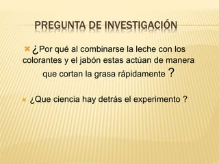 Este documento presenta un anteproyecto sobre un experimento que combina leche, colorantes y jabón. La pregunta de investigación es por qué estos ingredientes actúan rápidamente para cortar la grasa de la leche. El jabón rompe la tensión superficial del agua y hace que las gotas sean más pequeñas, lo que permite que los colorantes se separen y mezclen. El objetivo final es demostrar que la ciencia está presente en la vida cotidiana y no se requiere ser un científico para realizar experimentos básicos.