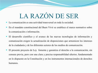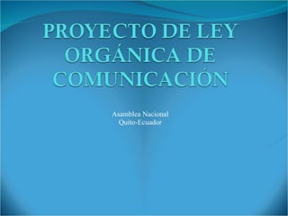 El proyecto de ley en Ecuador busca garantizar el derecho a la comunicación y la información, promoviendo la participación ciudadana y la responsabilidad de los medios de comunicación. Establece normativas sobre la libertad de expresión, la protección de los derechos fundamentales, y la clasificación de los medios en públicos, privados y comunitarios. Además, regula la responsabilidad editorial, la publicidad, y crea el Consejo Nacional de Comunicación e Información para supervisar y velar por el ejercicio comunicacional adecuado.