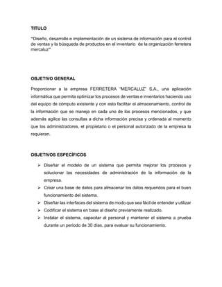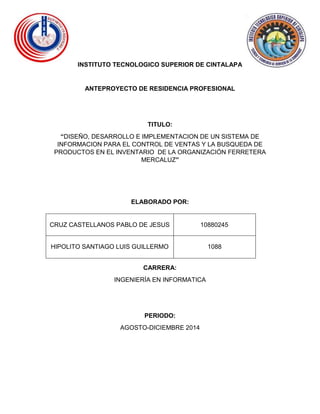 Este documento describe un proyecto de residencia profesional para diseñar e implementar un sistema de información para controlar las ventas y buscar productos en el inventario de la ferretería Mercaluz. El sistema permitirá optimizar los procesos de ventas e inventarios mediante el almacenamiento y control de información de manera ordenada para facilitar consultas. El proyecto tendrá un periodo de 6 meses para su desarrollo e implementación.