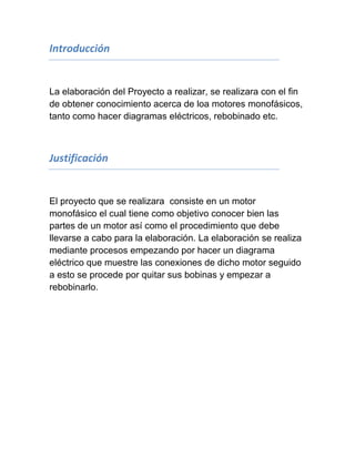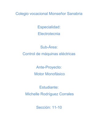 Este documento describe un proyecto de un motor monofásico realizado por una estudiante. El proyecto tiene como objetivo aprender sobre los motores monofásicos, incluyendo hacer diagramas eléctricos y rebobinar el motor. El marco teórico explica que un motor monofásico de fase partida tiene dos bobinas, una principal y otra auxiliar para el arranque, y que usa un interruptor centrífugo para desconectar la bobina auxiliar después del arranque. También lista los materiales necesarios para el proyecto y sus precios