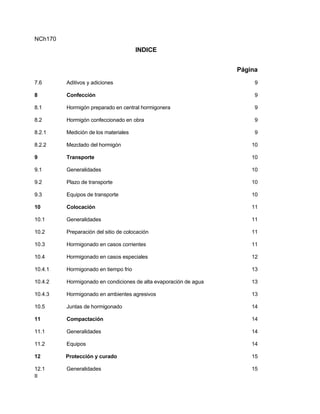 Este documento presenta los requisitos generales para la elaboración, transporte, colocación, compactación y curado de hormigones. Incluye la clasificación de hormigones según su resistencia a compresión y tracción, así como categorías de exposición considerando factores como ciclos de hielo-deshielo o presencia de sulfatos. Además, establece términos y definiciones relevantes para la norma como dosificación, razón agua/cemento y resistencia mecánica.