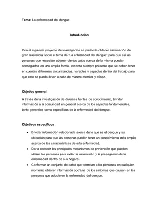 Este documento presenta un proyecto de investigación sobre la enfermedad del dengue con el objetivo de brindar información a la comunidad sobre los aspectos fundamentales de la enfermedad. El proyecto busca proporcionar datos sobre qué es el dengue, sus síntomas, métodos de prevención y tratamiento, con el fin de que las personas estén informadas sobre la enfermedad. La investigación recolectará información de diversas fuentes para crear un recurso accesible sobre el dengue dirigido a cualquier persona interesada, pero enfocándose especialmente en zon