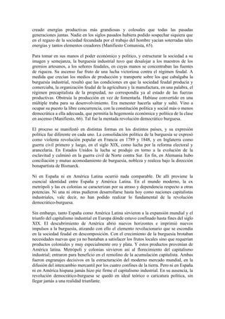 Este documento discute el desarrollo del capitalismo en España y América Latina. Explica que ni España ni las colonias latinoamericanas pudieron desarrollarse como naciones capitalistas industriales, ya que sirvieron principalmente como proveedores de materias primas para Europa. A pesar de que contribuyeron a la expansión del mercado mundial, no pudieron realizar plenamente la revolución democrático-burguesa. Debido a esto, tanto España como América Latina permanecieron atrasadas y dependientes del capitalismo europeo.