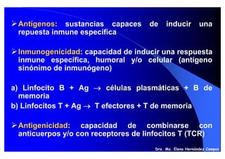 Este documento describe los conceptos fundamentales relacionados con los antígenos. Define antígenos como sustancias capaces de inducir una respuesta inmune específica. También describe la inmunogenicidad, antigenicidad, alergenicidad, tolerogenicidad y los factores que afectan la inmunogenicidad como la naturaleza, tamaño y degradabilidad del antígeno. Además, explica los conceptos de epitopos, haptenos, adyuvantes, mitógenos y superantígenos.