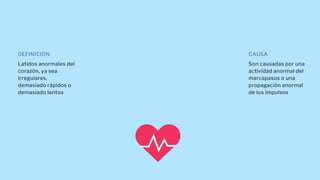 El documento detalla las causas y tratamientos de los latidos anormales del corazón, que pueden ser irregulares, rápidos o lentos debido a disfunciones del marcapasos o propagación anormal de impulsos. Se mencionan diversos medicamentos, como procainamida, lidocaína y amiodarona, utilizados para tratar diferentes tipos de arritmias. Además, se describe el impacto de ciertos bloqueos en los canales iónicos y los efectos en la contractilidad y frecuencia cardíaca.