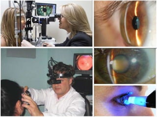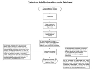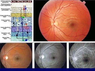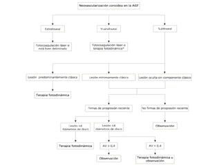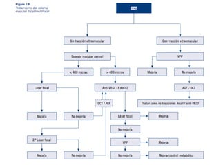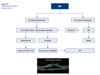 El documento proporciona información sobre varias patologías retinianas como la obstrucción de la vena central de la retina, la retinopatía diabética, la degeneración macular relacionada con la edad y el uso de antiangiogénicos para tratar el edema macular asociado a estas enfermedades. Explica los estudios clínicos que evalúan la eficacia de fármacos anti-VEGF como ranibizumab, bevacizumab y triamcinolona intravítrea. Además, describe los hallazgos principales