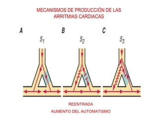 El documento describe los mecanismos de producción de las arritmias cardiacas y los diferentes tipos de antiarrítmicos. Explica que las arritmias se producen por alteraciones en la generación o conducción del potencial de acción cardíaco. Los antiarrítmicos se clasifican en cuatro grupos según su mecanismo de acción sobre canales iónicos. El documento analiza los principales fármacos de cada grupo y sus efectos adversos.