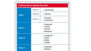 Los antiarrítmicos ejercen su acción modificando los tiempos del potencial de acción de la célula miocárdica. Se clasifican en 4 grupos según su mecanismo de acción: Grupo I (bloqueadores de canales de sodio), Grupo II (bloqueadores beta), Grupo III (bloqueadores de canales de potasio) y Grupo IV (bloqueadores de canales de calcio). Cada grupo incluye fármacos específicos, sus mecanismos de acción, indicaciones y efectos adversos.