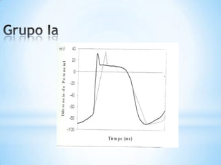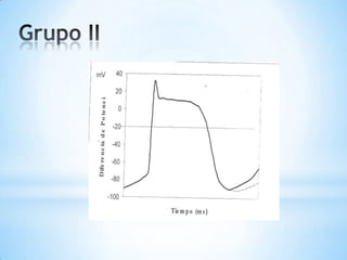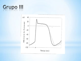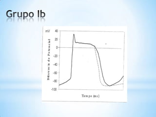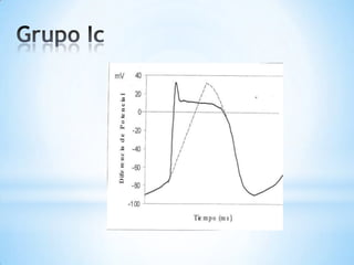 Este documento describe las propiedades electrofisiológicas, farmacocinéticas y efectos adversos de varios fármacos antiarrítmicos. Describe las características de iones como Na+ y Ca++, las fases de la despolarización cardiaca, y trastornos de la generación de impulsos y la conducción. Explica la clasificación de los antiarrítmicos en grupos I a IV y sus mecanismos de acción a nivel celular.