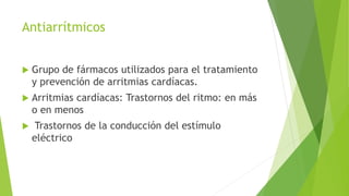 El documento habla sobre diferentes antiarrítmicos, incluyendo procainamida, lidocaina, amiodarona, adenosina y metoprolol. Describe las indicaciones, mecanismo de acción, dosis, contraindicaciones, precauciones y reacciones adversas de cada uno. Los antiarrítmicos se utilizan para tratar y prevenir arritmias cardíacas mediante diferentes mecanismos como disminuir la excitabilidad miocárdica, prolongar el periodo refractario o inhibir la estimulación adrenérgica.