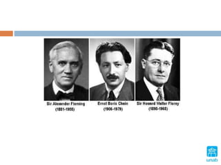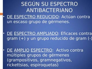 Este documento resume la historia de los antimicrobianos y la penicilina. Alexander Fleming descubrió la penicilina en 1928 al encontrar que un hongo del género Penicillium inhibía el crecimiento de estafilococos en un cultivo contaminado. A lo largo de los años se descubrieron otros antibióticos importantes como las sulfonamidas en 1932 y la eritromicina en 1952. Los antimicrobianos son un recurso terapéutico que solo debe usarse cuando es necesario debido al problema creciente de resistencia bacteriana.