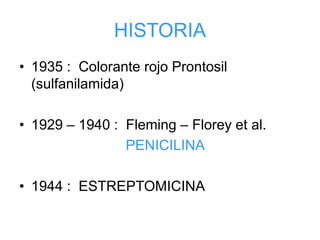 El documento describe los antimicrobianos y su clasificación. Los antimicrobianos inhiben o matan microorganismos y pueden ser producidos naturalmente por microbios o sintetizados químicamente. Se clasifican según su origen, efecto, mecanismo de acción y estructura química. Además, se explican los mecanismos de resistencia bacteriana a los antimicrobianos, los cuales incluyen enzimas, alteraciones en el blanco y bombas de eflujo.