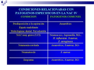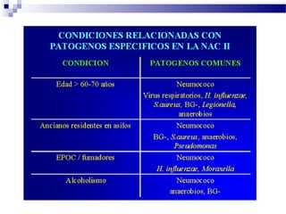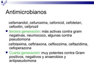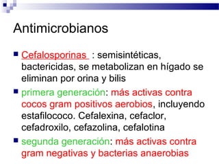 El documento describe las principales clases de antimicrobianos, incluyendo cefalosporinas, carbapenems, monobactams, glucopéptidos, inhibidores de la síntesis de proteínas y sus mecanismos de acción. Explica las generaciones de cefalosporinas y sus espectros de actividad, así como los efectos adversos y usos clínicos de los diferentes antimicrobianos. Finalmente, discute conceptos como farmacocinética, farmacodinamia y factores a considerar para elegir un agente antimicrobiano