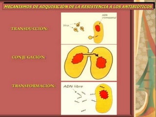 El documento describe los diferentes tipos de antibióticos, incluyendo betalactámicos, cefalosporinas de primera generación y penicilinas. Explica sus mecanismos de acción, mecanismos de resistencia bacteriana y posologías para ampicilina, amoxicilina y cefalexina.