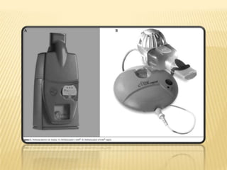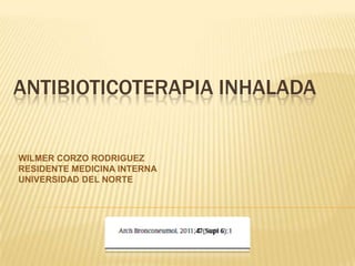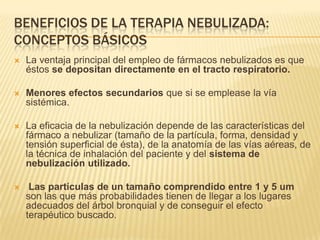 Este documento discute los beneficios de la terapia antibiótica nebulizada, incluyendo la entrega directa de fármacos al tracto respiratorio y menores efectos secundarios que la vía sistémica. También describe diferentes sistemas de nebulización y cómo se aplica la terapia antibiótica inhalada en varias enfermedades respiratorias como fibrosis quística, bronquiectasias e infecciones asociadas a ventilación mecánica.