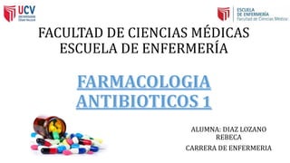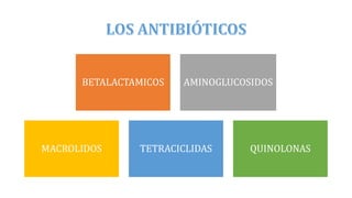 El documento proporciona información sobre diferentes tipos de antibióticos, incluyendo betalactámicos, aminoglucósidos, macrólidos, tetraciclinas y quinolonas. Explica la resistencia natural y adquirida de bacterias como Pseudomonas aeruginosa a varios antibióticos. También describe factores a considerar en la antibioticoterapia como la identificación del germen, sitio de infección, características del huésped y del fármaco.