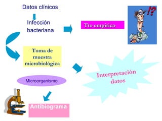 El documento habla sobre el uso adecuado de los antibióticos, la resistencia bacteriana y las prácticas de prescripción de antibióticos. Explica que el uso adecuado de antibióticos maximiza su efecto terapéutico y minimiza los efectos tóxicos y la resistencia. También describe los mecanismos de resistencia bacteriana como la inactivación por enzimas y las modificaciones que impiden la acción del antibiótico. Finalmente, señala que el uso injustificado y erróneo de antibióticos contribuye a la