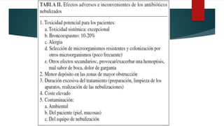 Este documento describe los diferentes antibióticos que pueden administrarse por vía inhalada para tratar infecciones pulmonares crónicas. Explica sus mecanismos de acción, indicaciones y ventajas como la alta concentración local y menores efectos sistémicos. También analiza evidencia sobre su uso en infecciones como la neumonía asociada a ventilación mecánica, bronquiectasias y EPOC para mejorar resultados y reducir exacerbaciones.