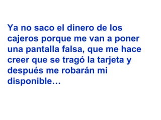 El documento expresa el miedo y paranoia de una persona que ha dejado de realizar muchas actividades cotidianas debido a temores infundados sobre posibles peligros. La persona ya no usa cajeros automáticos, consume Coca-Cola, va al cine o deja su auto estacionado por temor a ser robado o infectado. También ha dejado de comer varios alimentos, tener relaciones sexuales y usar electrodomésticos. A pesar de todos estos cambios, la persona no recibió los premios o beneficios que esperaba de particip